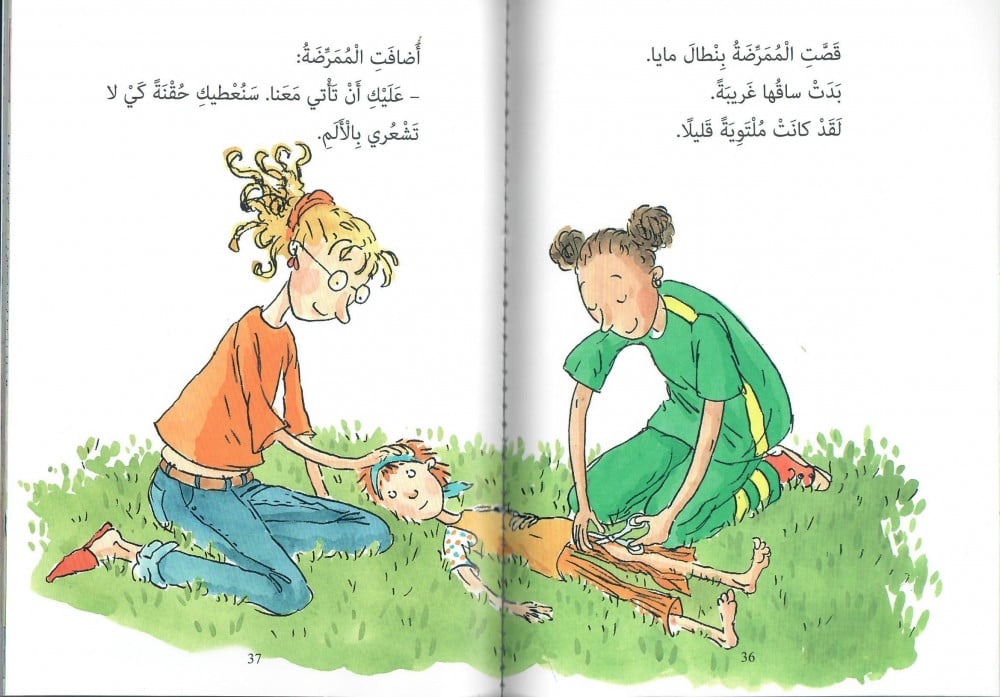 عندما سمعت مايا أن صديقتها عايدة لديها نطّاطة جديدة، تركت أسامة والأرنب بلبل يلعبان وحدهما وركضت لتقفز مع عايدة. بوينك، بوينك.. وأخذت إيدا ومايا تقفزان وتقفزان، وقامتا بحركات فنية كثيرة. لكن فجأة.. وقعت مايا ولم تعد تستطيع الوقوف على قدمها، ووصل صراخها إلى السماء