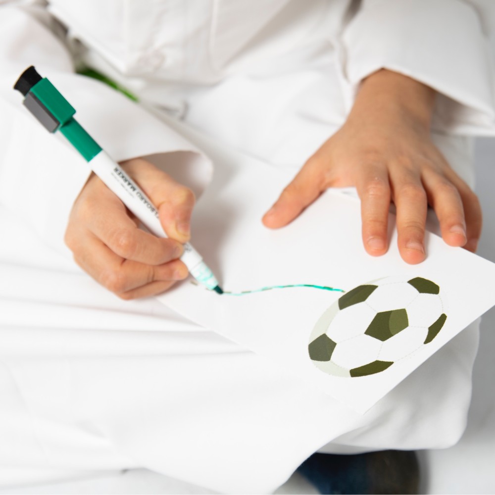 - معها قلم سبورة مناسب للأطفال.