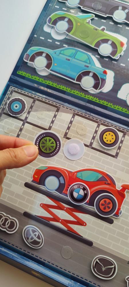 الهدف: تعزيز مهارات الإدراك البصري والتناسقية لدى الطفل من خلال اختيار وتركيب علامات السيارات والإطارات المناسبة، مما يساعده على تطوير الإبداع والمهارات الحركية الدقيقة في تفاعله مع الكتاب.