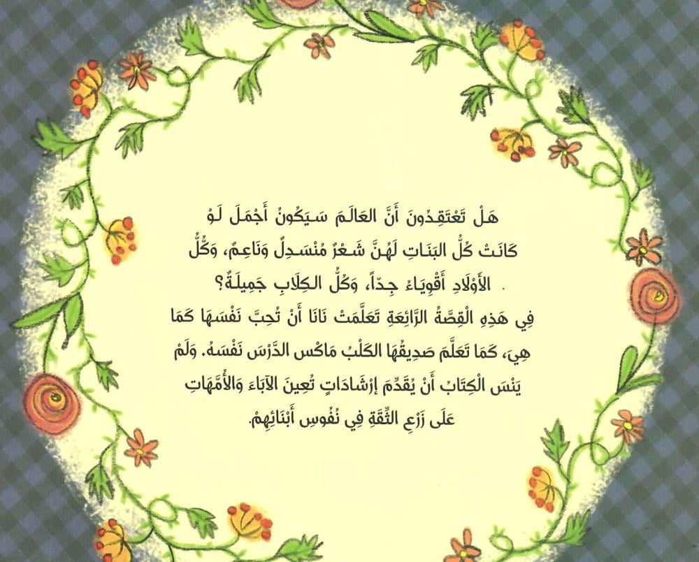 هَلْ تَعْتَقِدُونَ أَنَّ العَالَمَ سَيَكُونُ أَجْمَلَ لَوْ كَانَتْ كُلُّ البَنَاتِ لَهُنَّ شَعْرٌ مُنْسَدِلٌ وَنَاعِمٌ، وَكُلُّ الأَوْلَادِ أَقْوِيَاء جِدّاً، وَكُلُّ الكِلابِ جَمِيلَةً؟ فِي هَذِهِ الْقِصَّةُ الرَّائِعَةِ تَعَلَّمَتْ نَانَا أَنْ تُحِبَّ نَفْسَهَا كَمَا هِيَ، كَمَا تَعَلَّمَ صَدِيقُهَا الكَلْبُ مَاكْسِ الدَّرْسَ نَفْسَهُ. وَلَمْ يَنْسَ الْكِتَابُ أَنْ يُقَدِّمَ إِرْشَادَاتٍ تُعِينَ الْآبَاءَ وَالْأُمَّهَاتِ عَلَى زَرْعِ الثَّقَةِ فِي نُفُوسِ أَبْنَائِهِمْ.